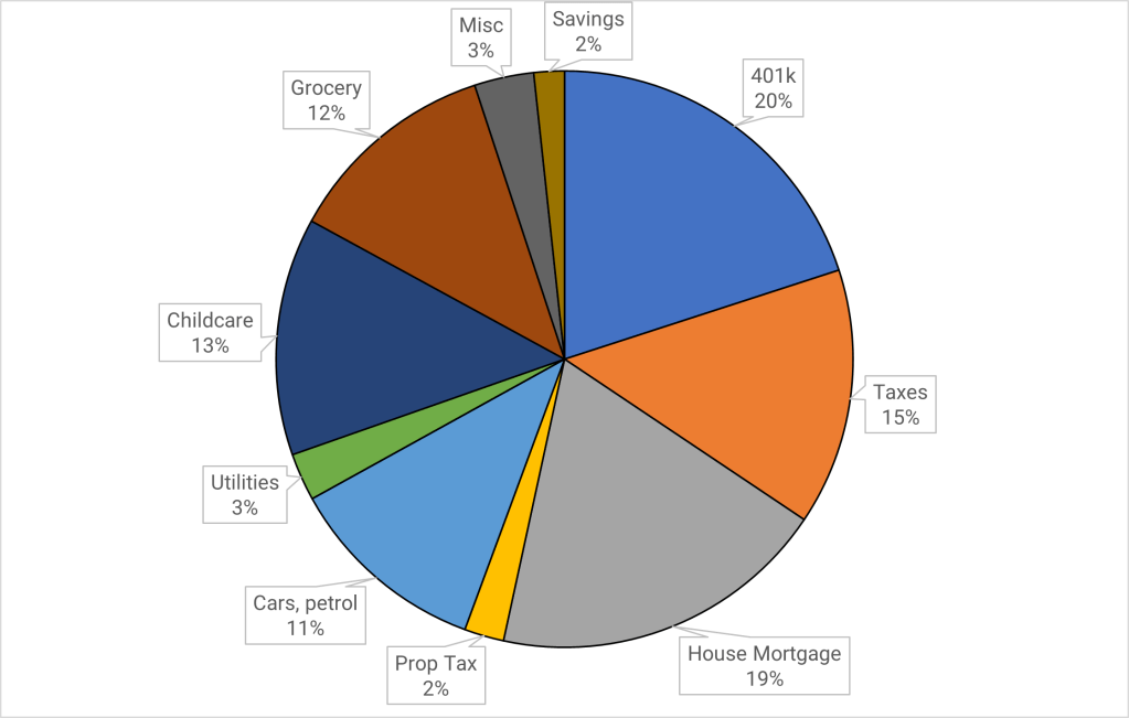The pie-chart below is used to illustrate this point, with one key assumption – You max out your monthly 401k contribution (unless there are some dire circumstances, this should be your default situation), which that allows you to drop into a 15% tax bracket. If you buy a massive $540,000, with a mortgage of $459,000 (15% downpayment), then your monthly payment is 19% of your post-tax income. Banks will have no problem approving this mortgage application, and you will walk away thinking you have got a good deal from the bank. Unless you have an alternate source of income, this pie chart leaves you 2% monthly savings for any unexpected expenses or vacations!