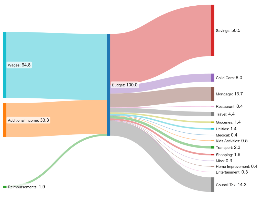 The “kids activities” category shows up for the first time this month – our son goes through 1 new pair of shoes every month! Unfortunately, not joking. He runs like the wind at parks or in any open space, and scrapes the soles of his tiny toddler shoes down to a millimeter within a few weeks of purchase. Combined with this, he also started a weekend “football” session for kids for 45min on Saturday afternoons. It seems to tire him out and he sleeps better, which means we sleep better. For £20 a month, we think it’s a fabulous deal!