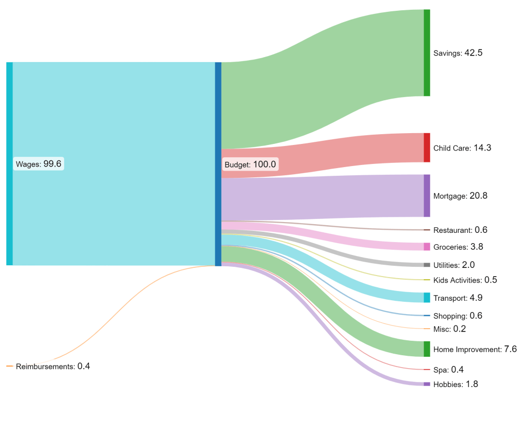 • Savings pot is back at our desired range of 35-45% (i.e., one person’s full paycheck). This will add up at the end of the year and allow us to make our annual overpayment on our mortgage.